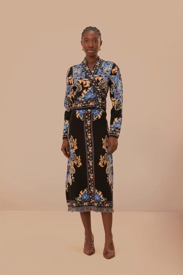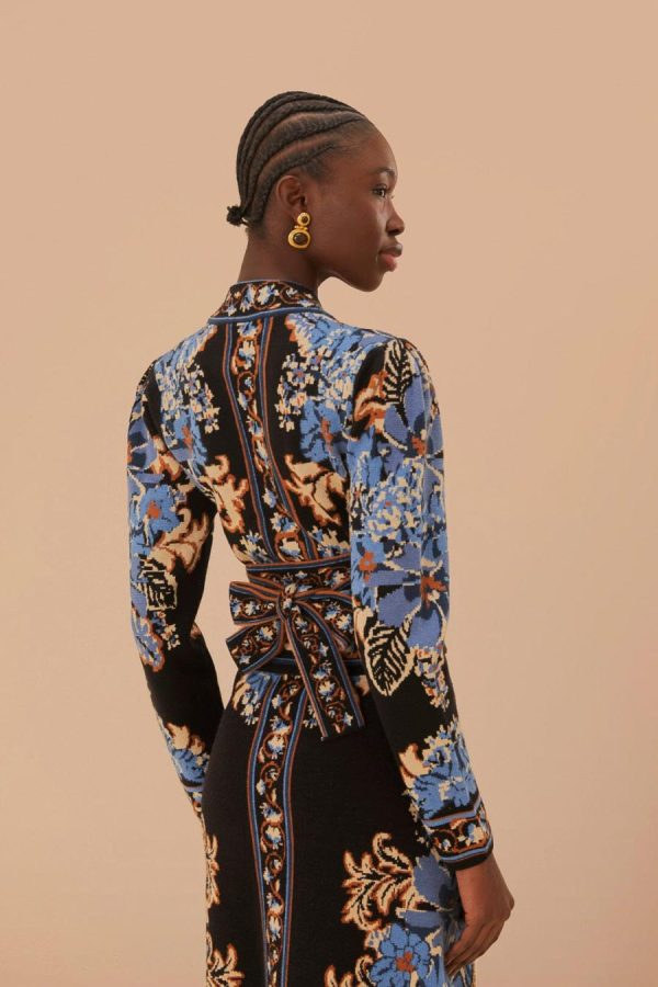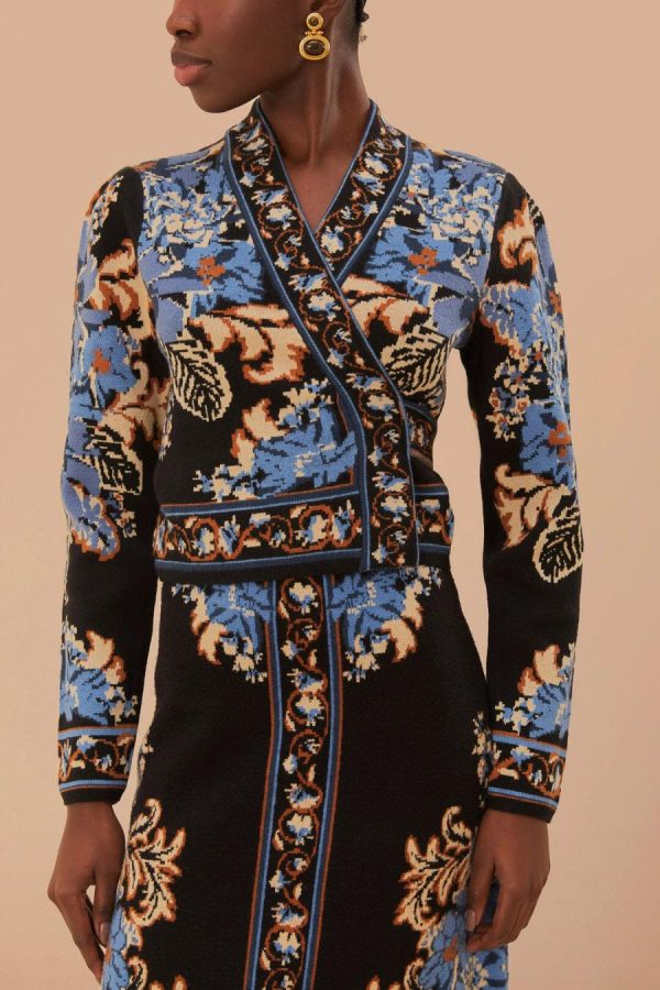 Embrace the allure of the Black Blossom Tapestry Knit Wrap Blouse, a piece where elegance meets comfort. Draped in a sumptuous wrap style, this blouse displays a lavish tapestry of florals in a striking blue and cream palette against a classic black backdrop. A delicate V-neckline and svelte long sleeves complete the silhouette, making it an exceptional choice for both daytime gracefulness and evening charm.