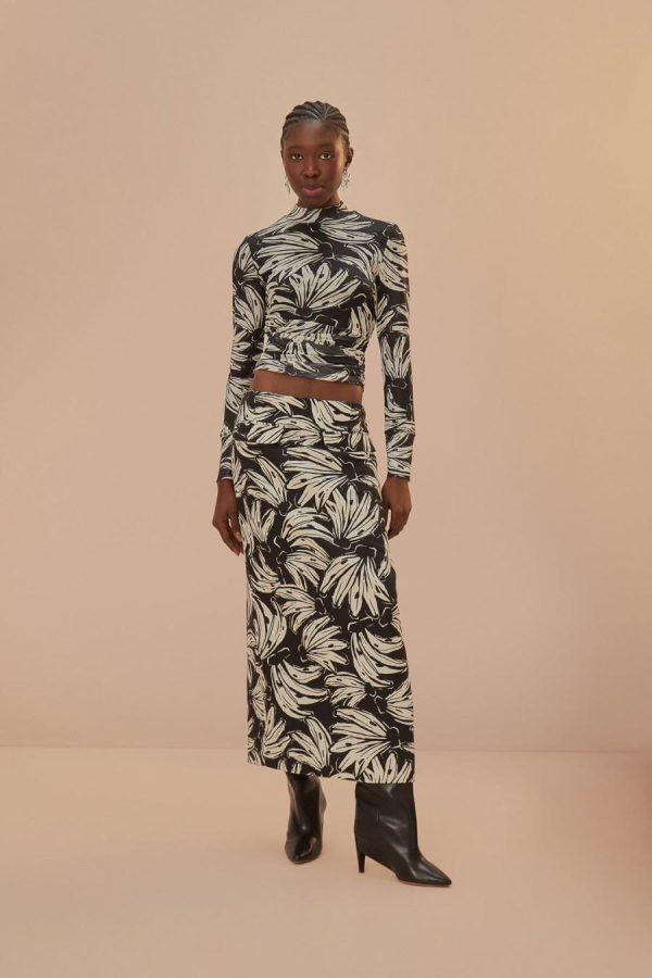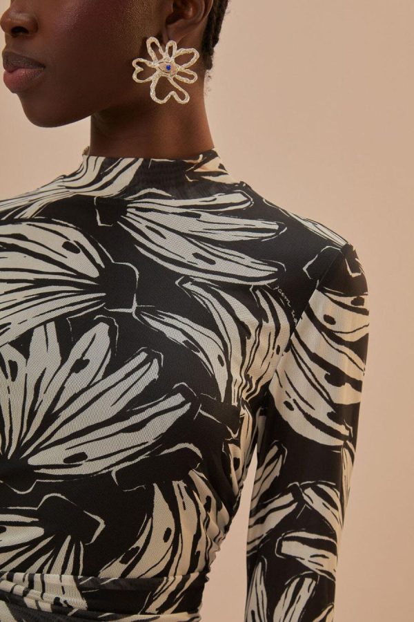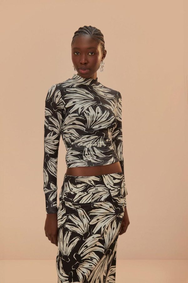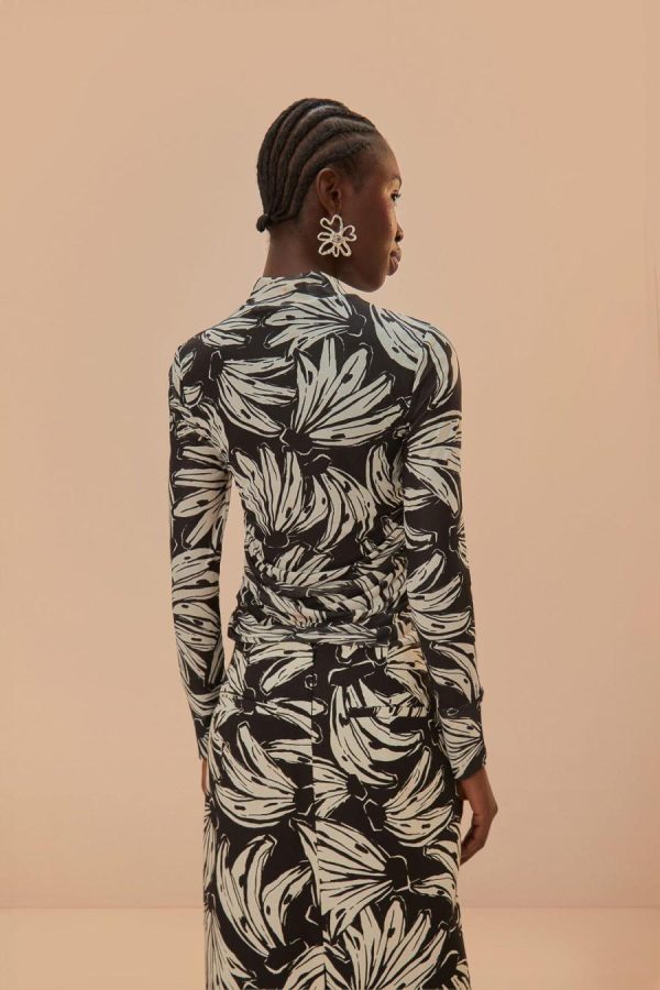Embrace the tropical allure of the Black Bossa Banana Tulle Blouse, a high-necklined treasure showcasing an evocative black and white banana leaf print. This piece is crafted with a sheer tulle elegance and features a bold, yet delicate pattern that dances across its fitted silhouette. Each movement creates a poetry of shadows and light, symbolizing FARM Rio’s commitment to exquisite details and expressive fashion narratives.