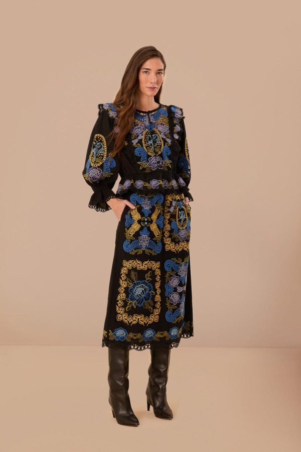 Bring effortless charm to your wardrobe with the Black Richelieu Blouse from FARM Rio. This round neckline top features intricate embroidery and eyelet fabrics that create a stunning silhouette. The delicate ruffles add a touch of femininity, while the black hue makes it versatile for any occasion. Perfectly crafted to make you stand out, this blouse is a must-have addition to your collection.