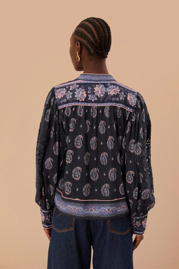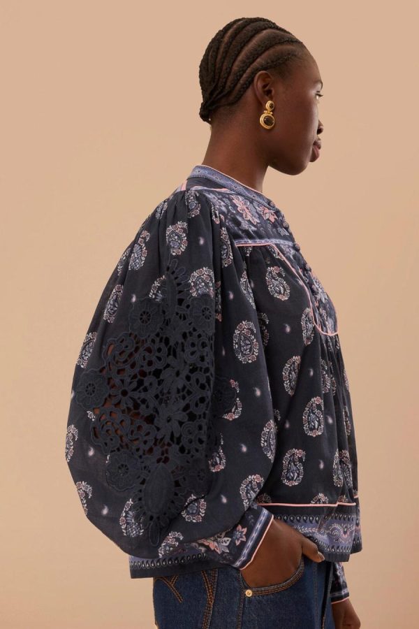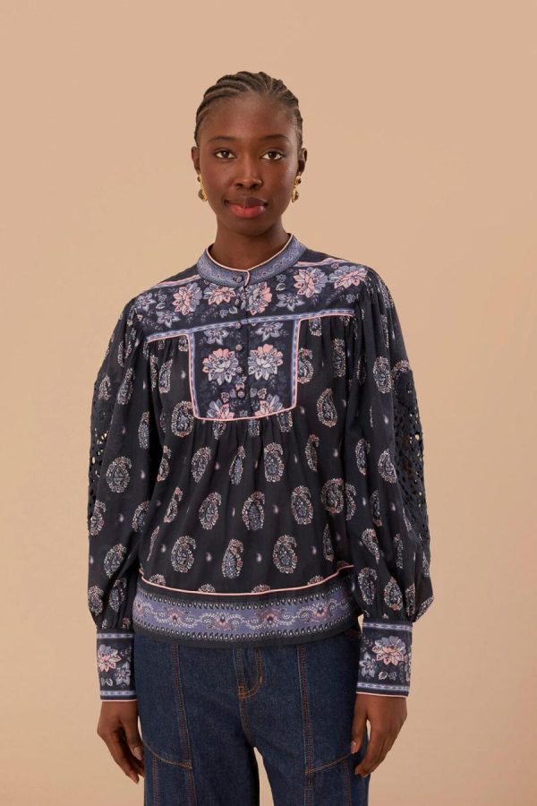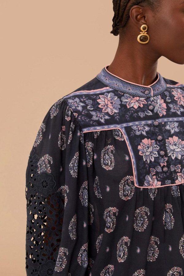 Embrace the enchanting charm of the Blue Ayla Long Sleeve Blouse. Crafted with a high neckline, this piece features a bold juxtaposition of intricate paisley and floral patterns, set against a deep blue canvas. Eye-catching eyelet details dance along the sleeves, adding a touch of romance. Its loose silhouette ensures comfort without sacrificing elegance, inviting a whisper of bohemian grace into your wardrobe.