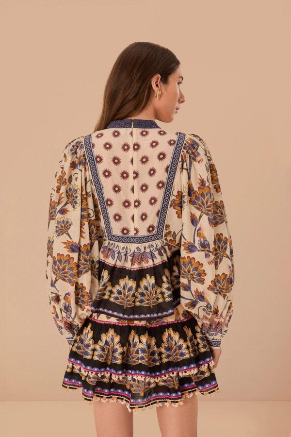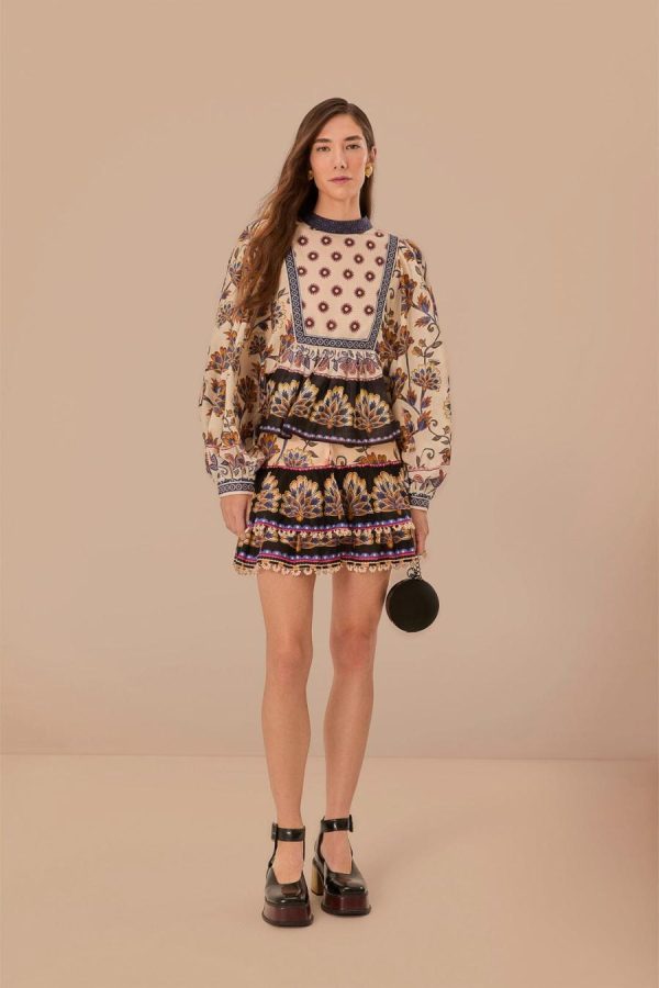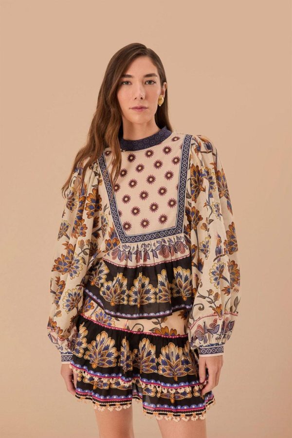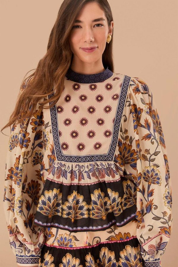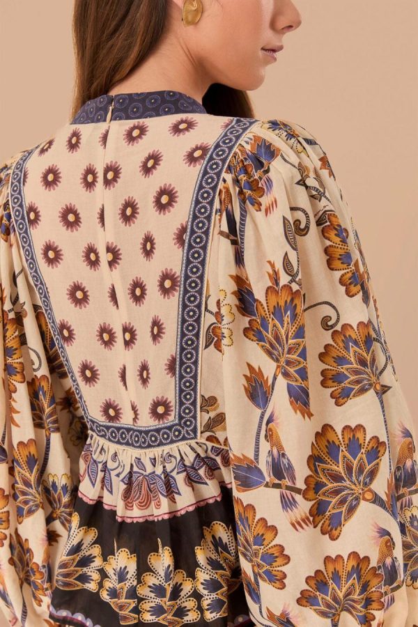 Embrace the essence of bohemian charm with the Cream Ainika Maxi Floral Blouse, crowned with a high neckline that enhances its elegant allure. Lush, earth-toned florals bloom across the fabric, harmonized by intricate detailing and contrasting geometric accents that frame the piece. Billowing sleeves and a relaxed, flowing silhouette invite a dance of movement, making this blouse a timeless piece that whispers stories of faraway places and warm, carefree days.