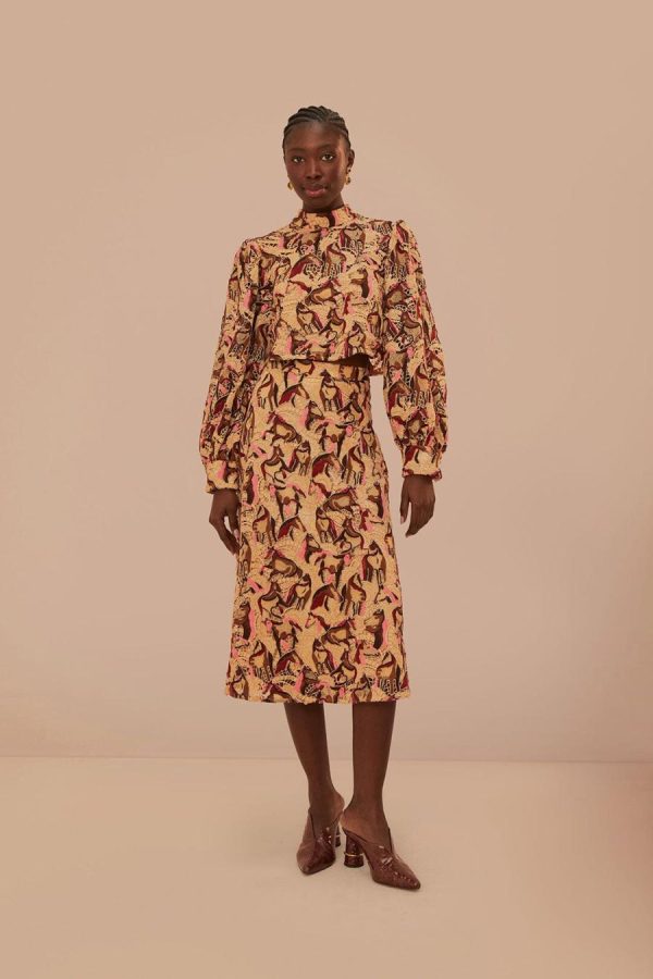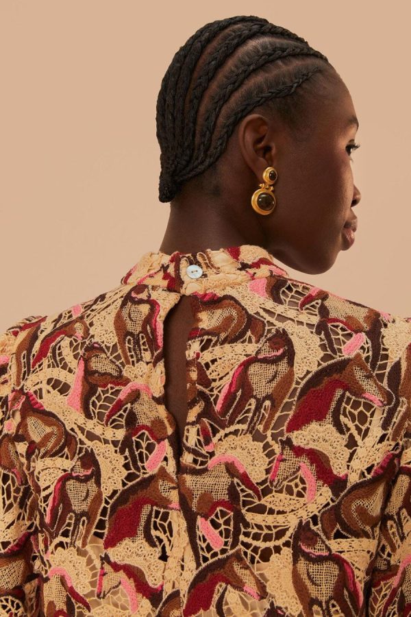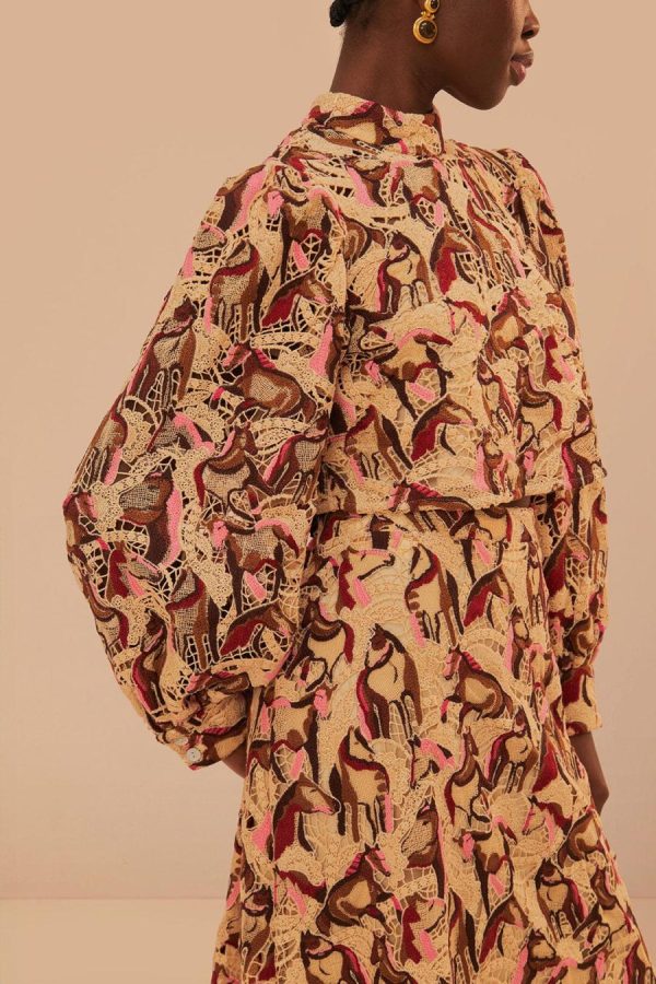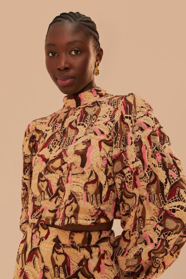 Embrace elegance with the Cream Horses Guipure Blouse, a unique piece that features a high neckline and an intricate horse-patterned guipure lace. Its cream backdrop is adorned with rich brown and soft pink hues, creating a visual feast that accentuates the whimsical design. The blouse’s subtle yet sophisticated silhouette is gently tailored, offering a touch of refinement to any outfit. Discover the charm of this delicate creation, where equestrian beauty meets contemporary chic.
