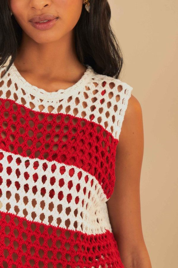 Embrace the playful charm of the Red Stripes Crochet Blouse, an exquisite piece featuring a bold interplay of crimson and alabaster hues. Its handcrafted crochet weave offers a glimpse of whimsy, while the relaxed fit and round neckline create a comfortable silhouette. Fringed detailing adds a touch of the bohemian, making this blouse a perfect match for sun-kissed days and balmy evenings.