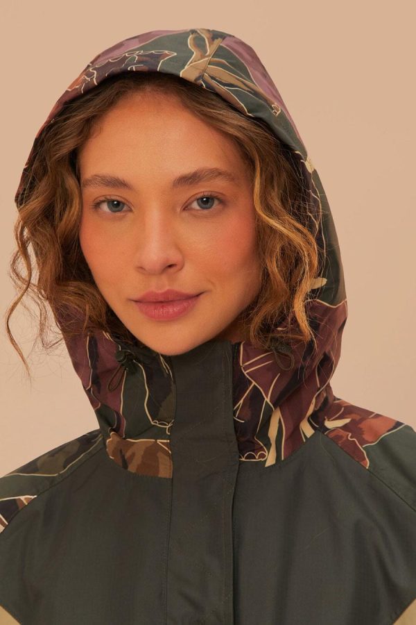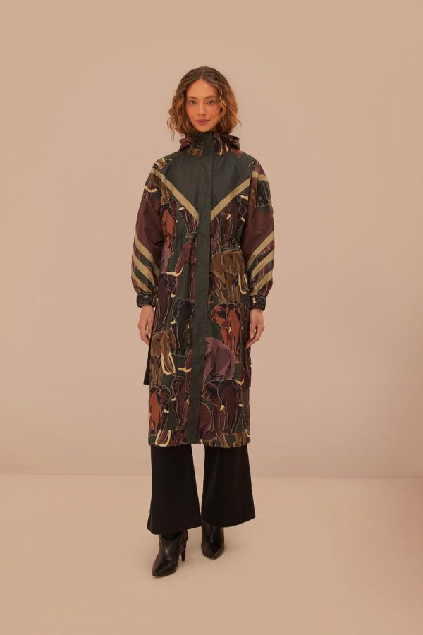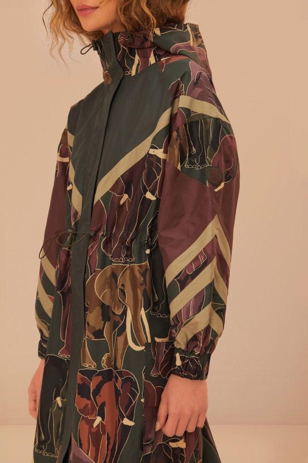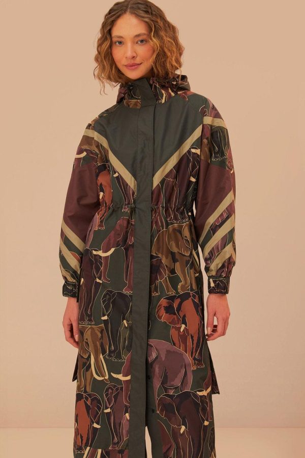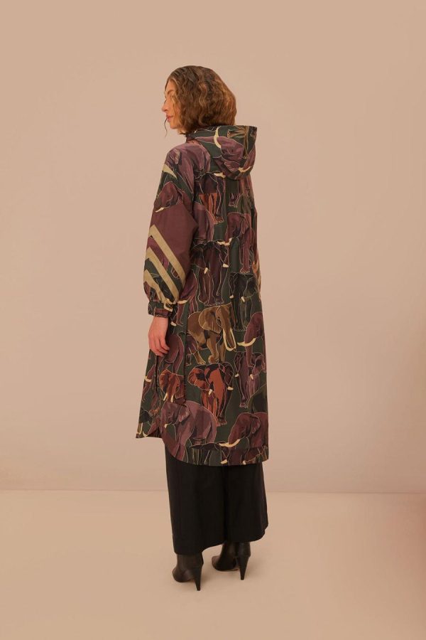 Embrace the whimsical charm of the Elephants Maxi Raincoat, a playful yet elegant addition to your wardrobe. This enchanting piece features a mesmerizing elephant print in earthy tones, complemented by striking stripes that add a touch of the exotic. The high neckline harmonizes with a fluid silhouette, crafting an alluring juxtaposition of form and space. This raincoat not only promises protection on a drizzly day but also ensures you remain a portrait of sophistication and vibrant storytelling.
