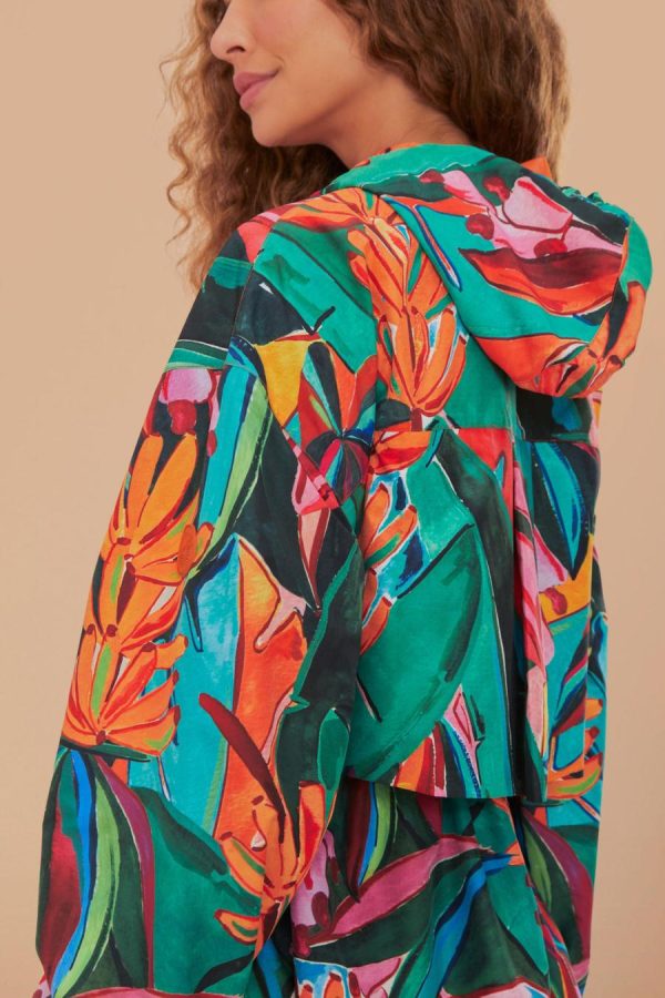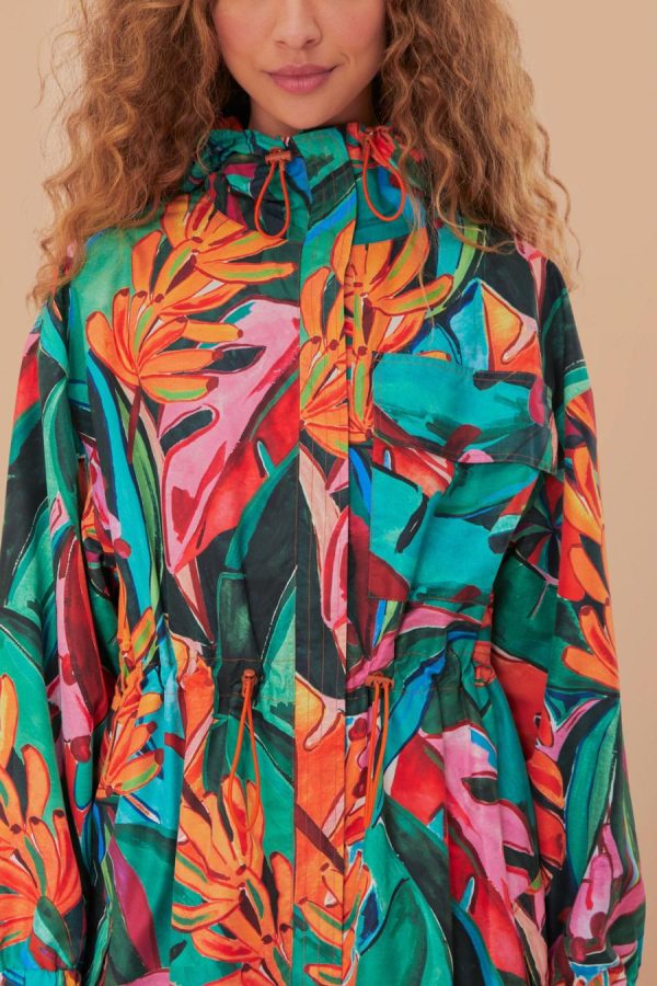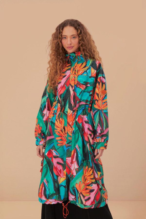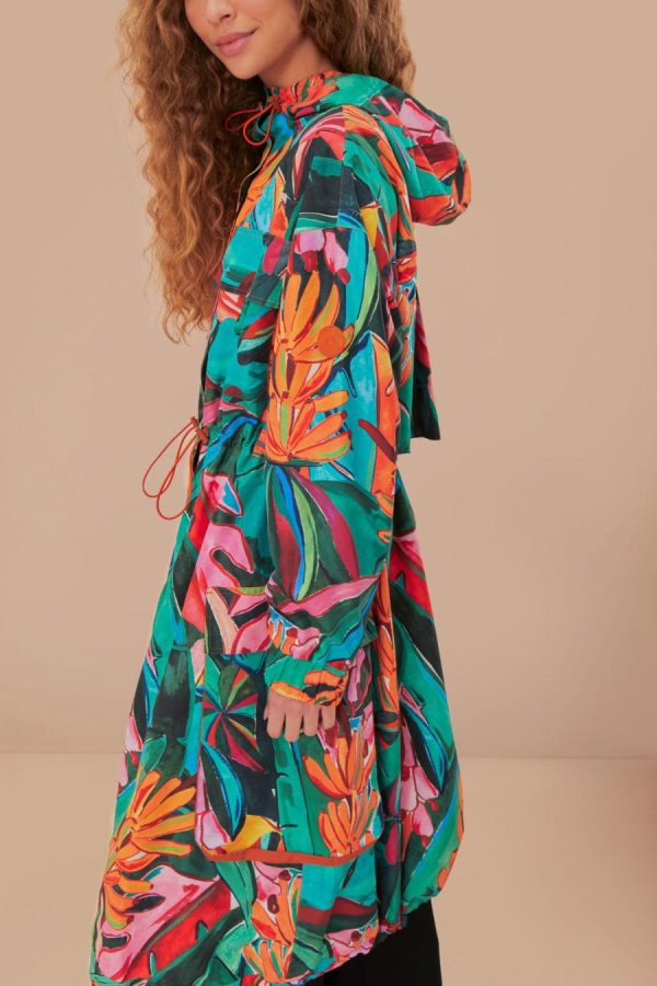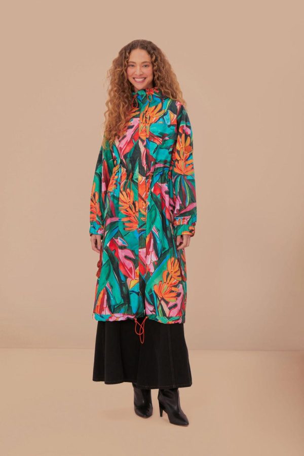 Embrace the tropical allure of the Green Banana Foliage Maxi Raincoat, where vivacious green tones play backdrop to a dance of lush banana leaf patterns in mesmerizing hues of orange and pink. A gently cinched waist and adjustable cord bring definition to its flowing silhouette, while the high neckline adds an air of sophistication. This statement piece effortlessly blends functional charm with FARM Rio’s signature bold style.