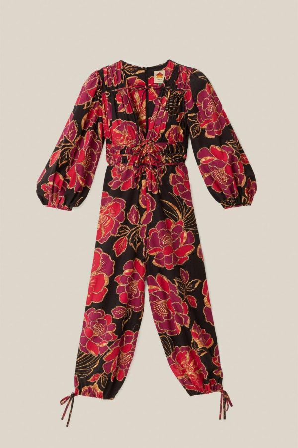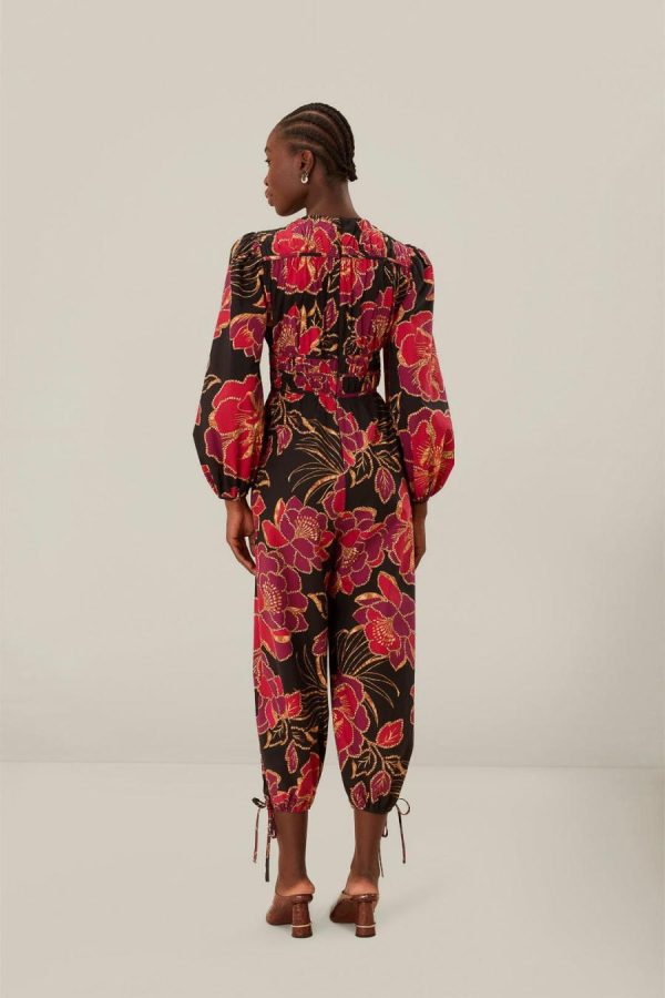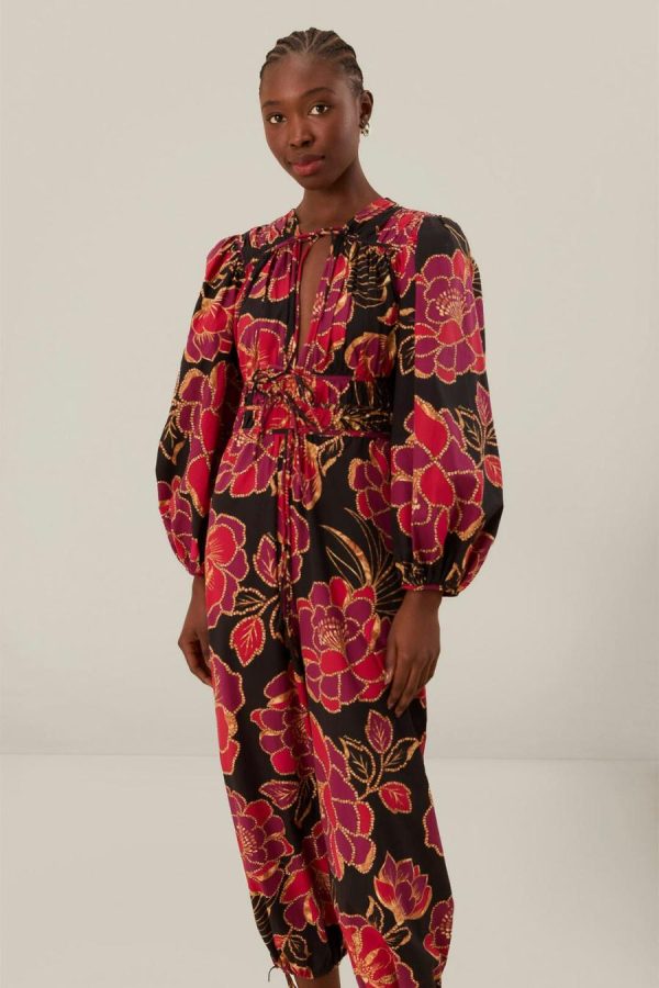Embrace bold elegance with the Black Shiny Chita Long Sleeve V Neckline Jumpsuit, showcasing a vibrant chita floral pattern that blooms across a sleek black backdrop. This piece features a flattering V neckline complemented by voluminous long sleeves and an accentuated waist, cinched with a delicate tie for a bespoke fit. Drawstring details on the cuffs lend a playful touch, ensuring a silhouette that radiates both sophistication and a free-spirited charm.