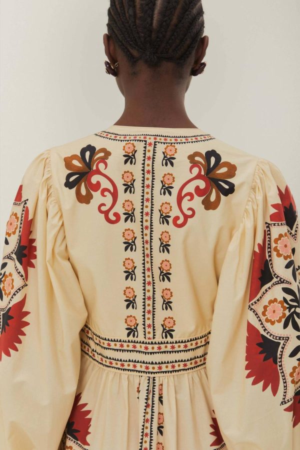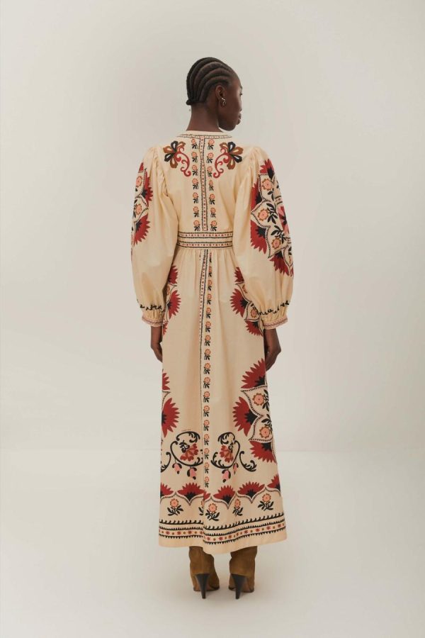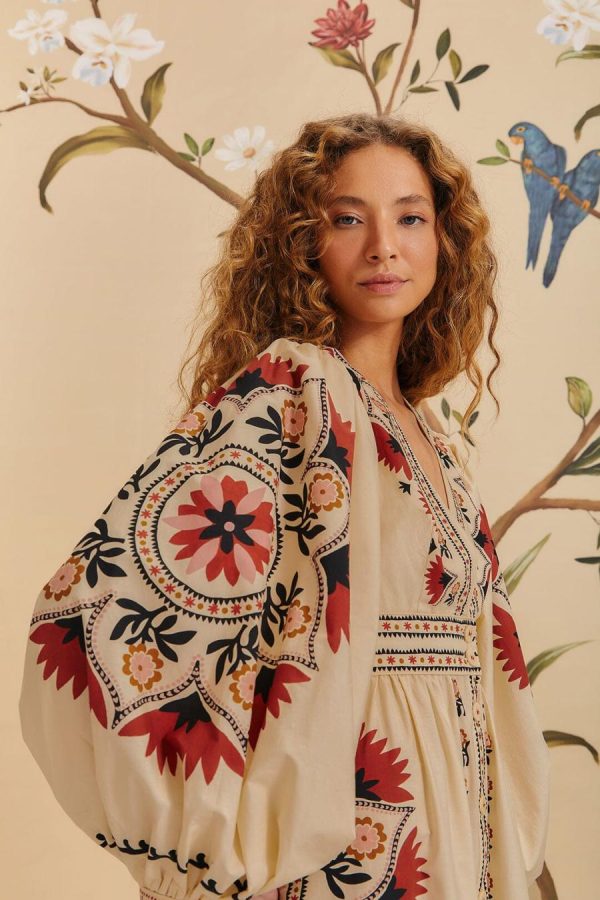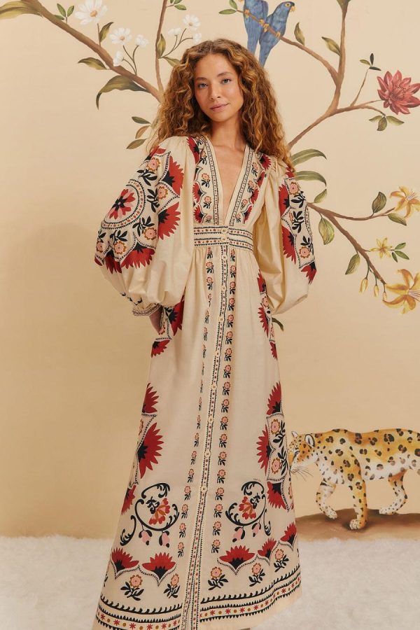 Embrace the harmonious blend of tradition and modernity in the Cream Cashew Mandala Maxi Dress. This piece celebrates a unique V neckline, while its floor-skimming silhouette is adorned with vibrant mandala-inspired patterns in rich reds and earthy tones. Bishop sleeves add a touch of bohemian grace, creating a flowy, ethereal effect. Each detail coalesces to craft an alluring narrative of style, making it a cherished addition to your wardrobe.