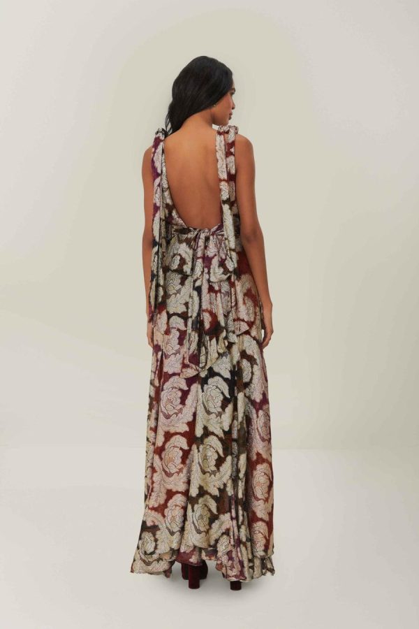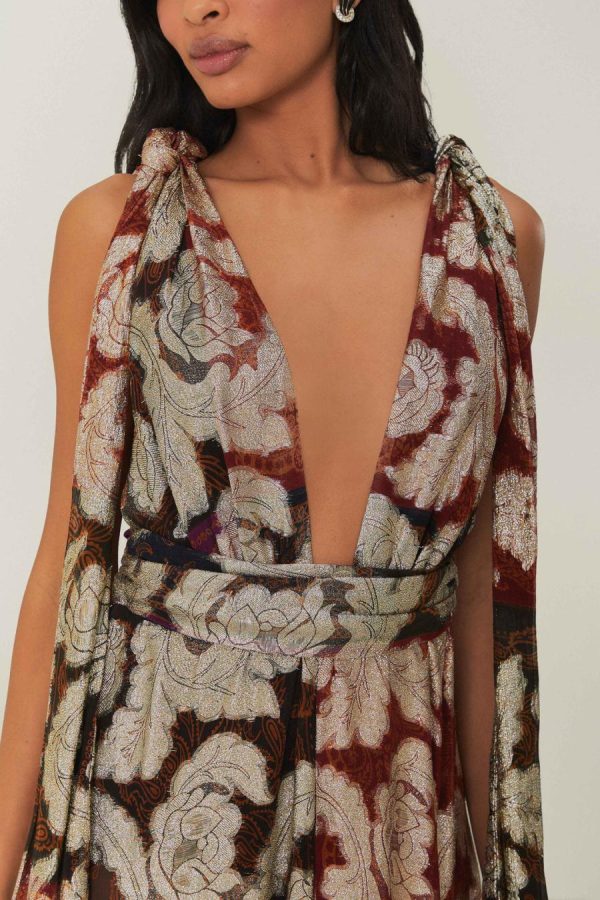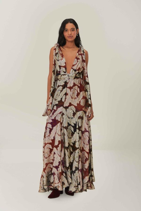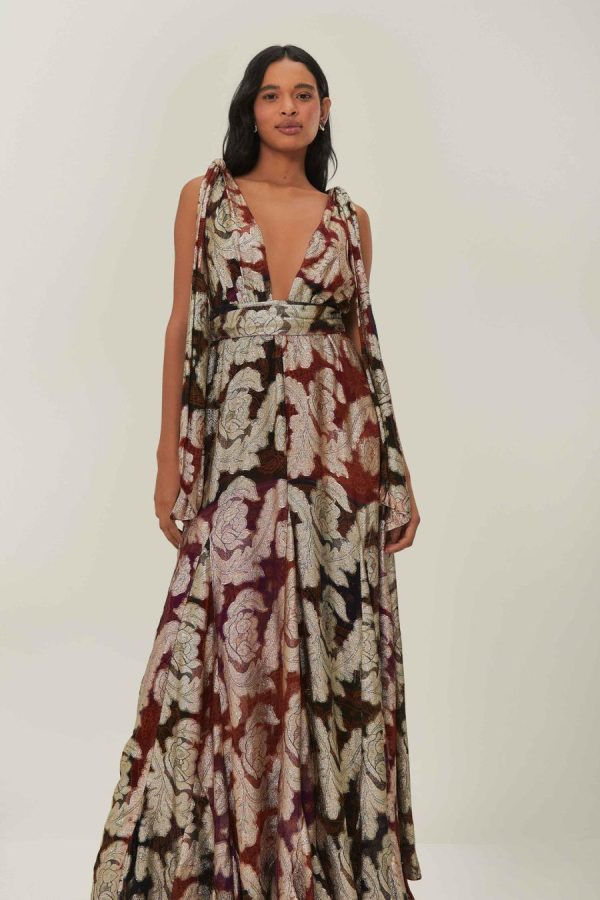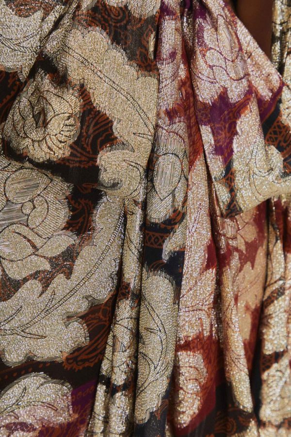 Embrace the enchanting allure of the Jacquard Lurex Sleeveless Maxi Dress, a captivating blend of metallic tones and luxurious jacquard patterning that dances in the light. This stunning piece features a collar neckline softened by ruffled straps and a flowing skirt that cascades gracefully to the floor. Crafted with materials mindful of the environment, it presents an elegant silhouette that whispers tales of romance and sophistication.