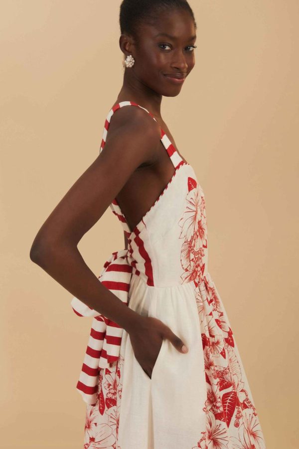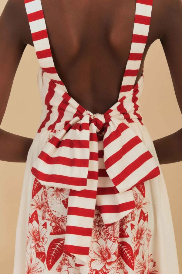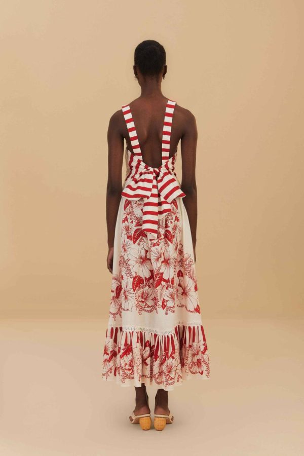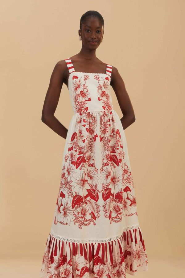 Embrace the essence of warm breezes and sun-kissed days with the Off-White Floral Chains Maxi Dress. Draped in delicate red flowers, intertwined with botanical chains, this maxi piece flourishes with an airy grace. Striped shoulder straps add a playful contrast, leading to a captivating tie-back design. Hand-embroidered touches bring a bespoke charm to its flowing silhouette. Crafted from thoughtfully chosen materials, this dress dances the line between dreamy and earth-conscious elegance.