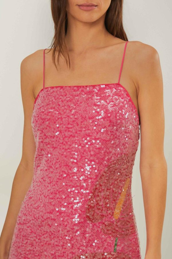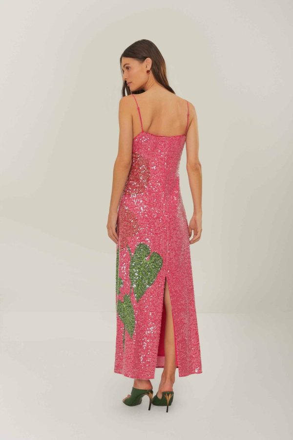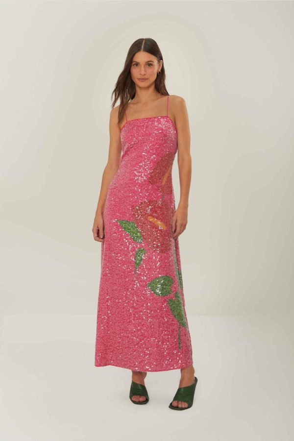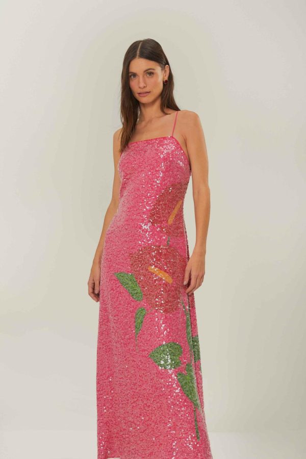 Embrace tropical elegance with the Anthurium Flowers Pink Slip Maxi Dress. Blooming with bold anthurium patterns accentuated by sparkling sequins, this dress shines in a vivacious shade of pink. The square neckline adds a touch of classic femininity, while the delicate straps and fluid silhouette promise graceful movement. An enchanting piece for those balmy evenings, it encapsulates the essence of summer joy.