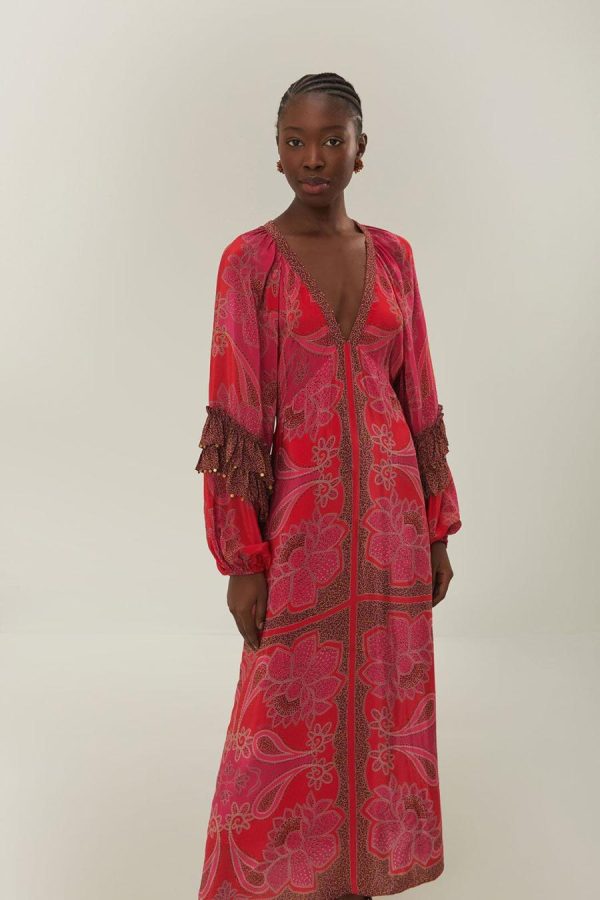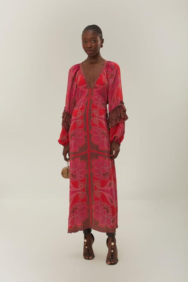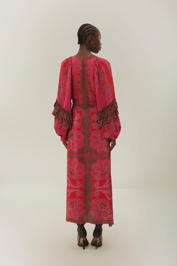 Embrace pure elegance with the Floral Glam Scarf Pink Maxi Dress by FARM Rio. This piece is a symphony of vibrant pink hues, adorned with eye-catching floral prints and intricate boho-inspired patterns. The high neckline enhances its sophistication, while the cascading ruffles on each wide sleeve add a touch of playful charm. Designed for breezy movements, this dress billows beautifully as you walk. Its relaxed silhouette ensures comfort without compromising on style, perfect for those sun-kissed days or enchanting evenings.