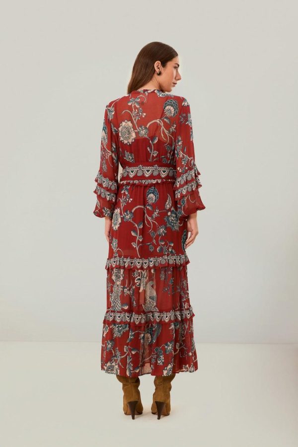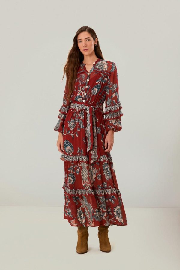 Embrace the vibrant essence of the tropics with the Red Tropical Landing Maxi Dress, boasting an alluring V neckline and a flowing silhouette. The dress is adorned with an enchanting blend of tropical botanicals and wildlife motifs, displayed over a warm red hue with subtle hints of contrasting colors. Its tiered skirt and drawstring waist accentuate form while providing comfort and movement, making it a perfect fusion of elegance and whimsical charm.