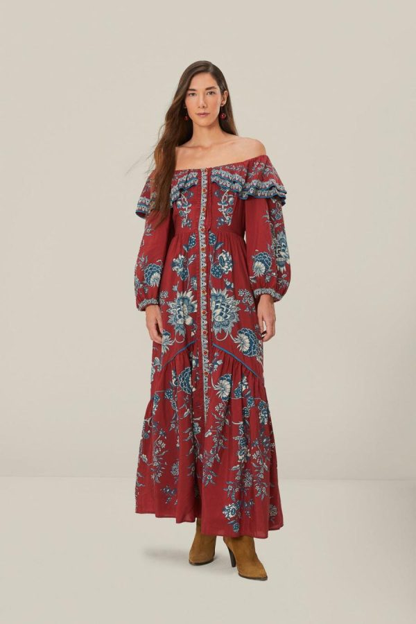 Embrace the warmth and vibrancy of summer with the Red Tropical Landing Off Shoulder Maxi Dress. Its enchanting off-shoulder design, featuring a ruffle trim that graces the collarbone, pairs with the flow of the tiered skirt to dance with each step. The earthy red hue serves as the canvas for a pattern of lush, botanical motifs, bringing to life the exotic beauty of a tropical escape. This dress invites endless compliments and captivates with every movement.
