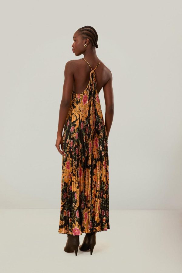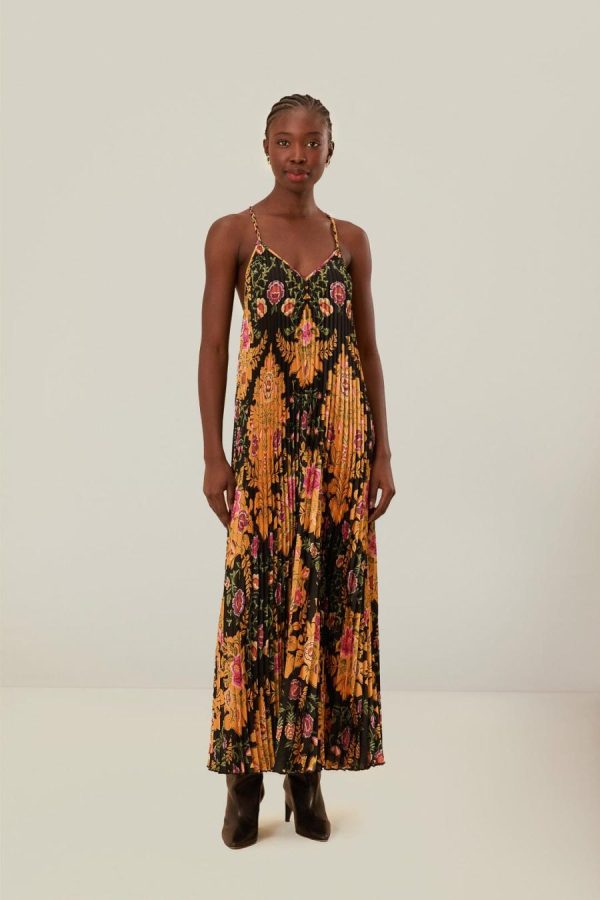 Discover the enchanting elegance of the Black Arabesque Floral Pleated Midi Dress. Adorned with a vivid pattern of florals in blush pink and ivory hues set against a deep black, this piece features delicate pleating that sways with every step. The graceful V neckline and slender spaghetti straps frame the shoulders beautifully, while the midi length affords a glimpse of whimsy. This dress invokes the spirit of a tropical escapade, perfect for serene evenings or spirited gatherings.