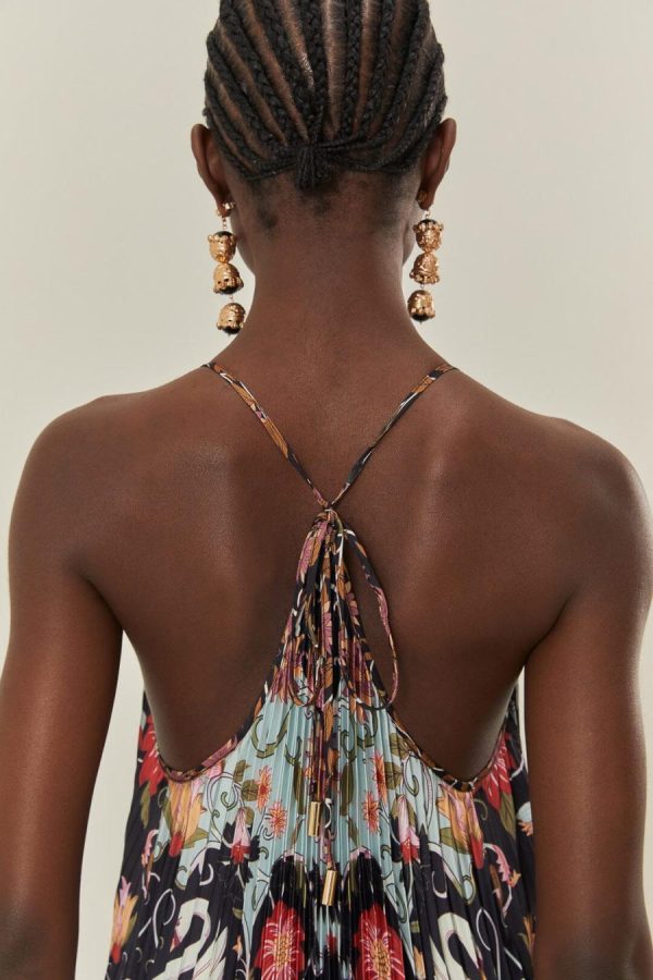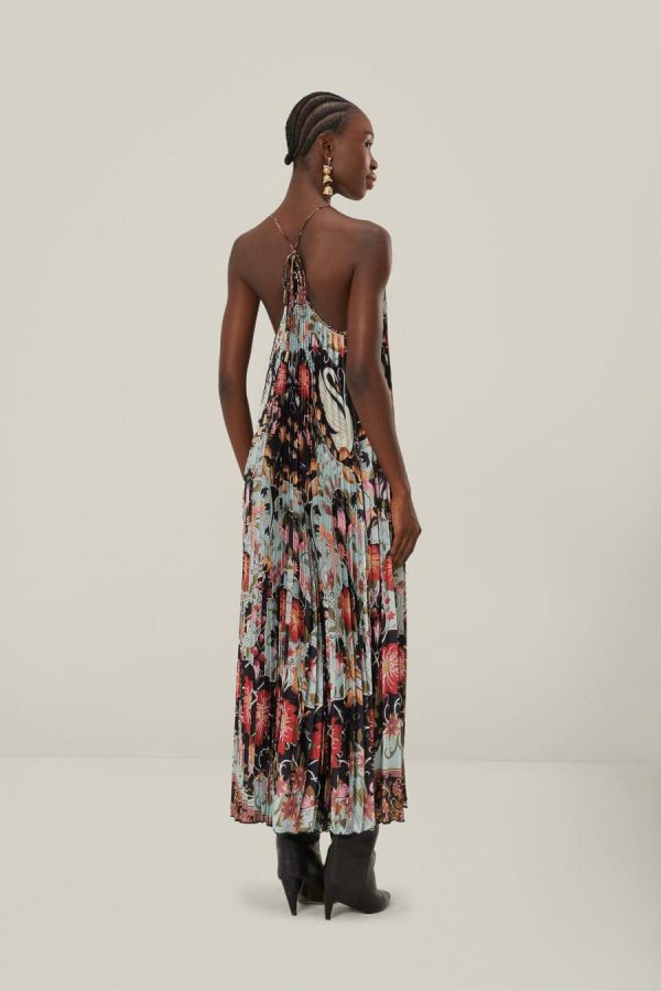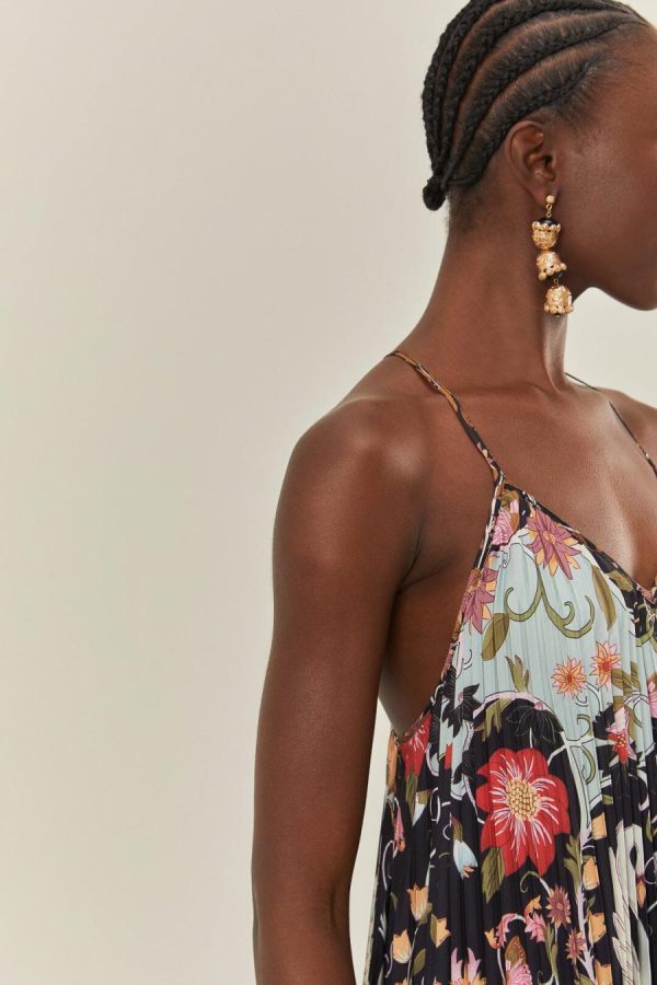 Embrace the charm of effortless style with the Blue Flowing Beauty Pleated Sleeveless Midi Dress, featuring a delicate V neckline that leads into a dance of pleated fabric. The dress blooms with a vibrant mix of colors and botanical motifs, creating a playful yet sophisticated silhouette. Delight in the interplay of light and movement as the pleats cascade down to a breezy midi length, perfect for sun-drenched days or balmy evenings.