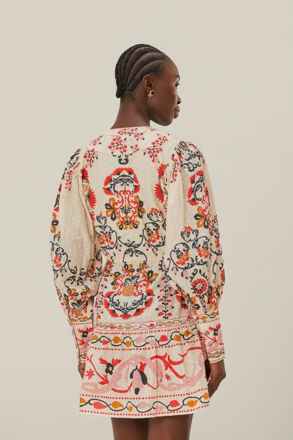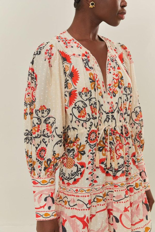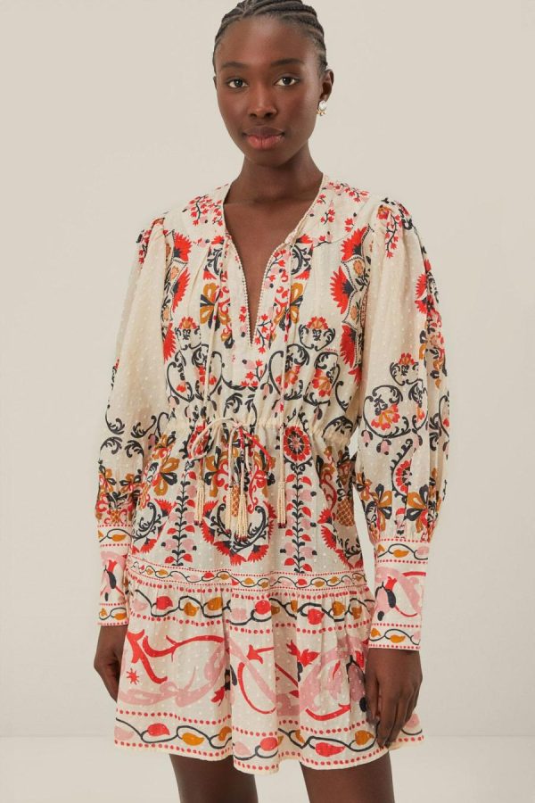 Discover the playful spirit of the Cream Cashew Mandala Mini Dress, a piece that captures the essence of tropical whimsy. Adorned with a vivid mandala-inspired print in rich reds, fresh oranges, and earthy tones, this dress features a flattering round neckline and a relaxed A-line silhouette. The gently gathered waist adds a touch of femininity, while the fluid long sleeves ensure a comfortable, effortless grace. A perfect blend of color and charm, it’s a celebration of artful dressing.