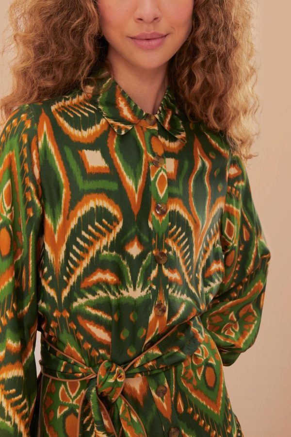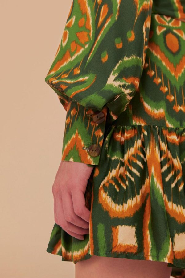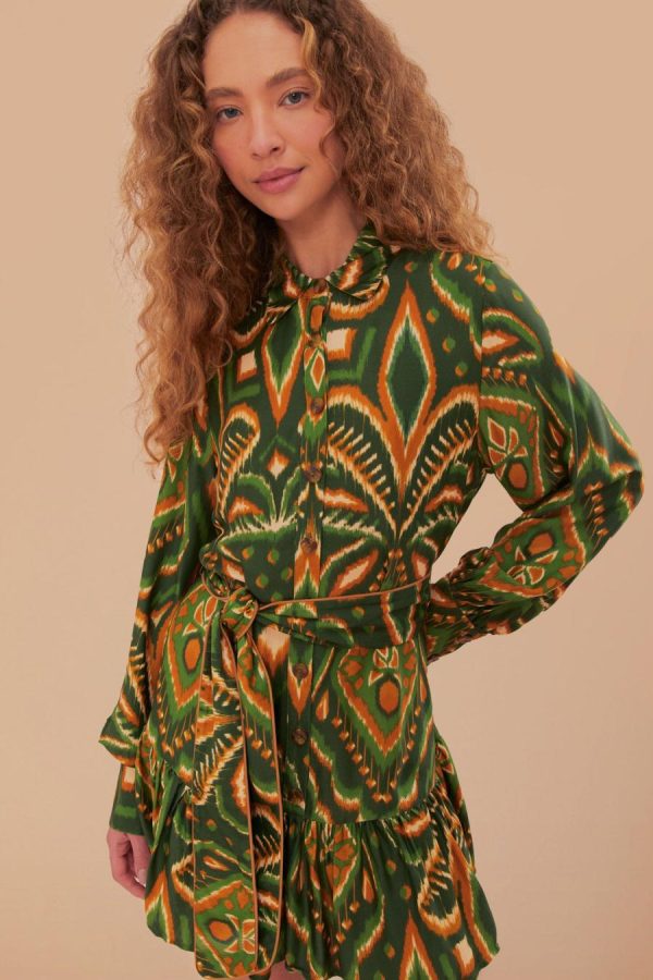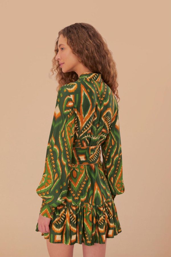 Step into the vibrant embrace of the Green Pineapple Ikat LENZING™ ECOVERO™ Viscose Mini Dress, where bold ikat prints flourish in shades of lush green and warm gold. This piece charms with a playful flounce hem, a self-tie waist for a flattering silhouette, and a chic collar neckline. Crafted with materials crafted with care for our world, this dress radiates an effortless elegance that’s as thoughtful as it is stylish.LENZING™ ECOVERO™: the eco-responsible fibers generate up to 50% lower emissions and water impact compared to generic viscose.
