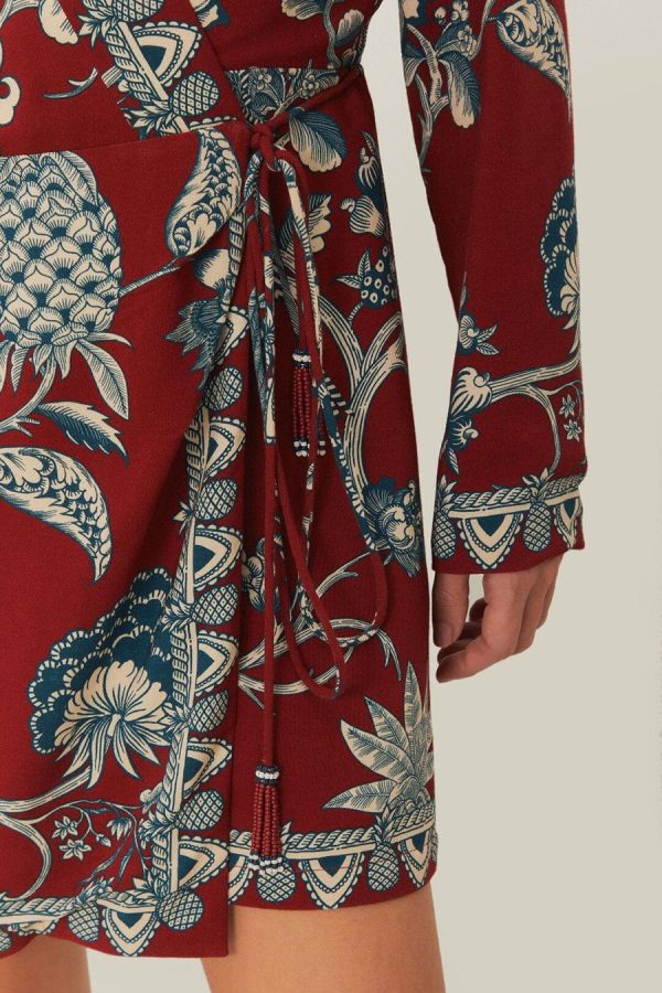 Embrace the vibrant essence of summer with the Red Tropical Landing Wrap Mini Dress, featuring an alluring V neckline. This enchanting piece is adorned with a bold, tropical print set against a sensual red backdrop, bringing to life an exotic flora fantasy. Crafted with a flattering wrap silhouette, it cinches at the waist with a tie, ensuring a bespoke fit that flutters with your every move. Its playful hem and billowy sleeves add a touch of whimsy, ready to captivate on any sunny escapade.