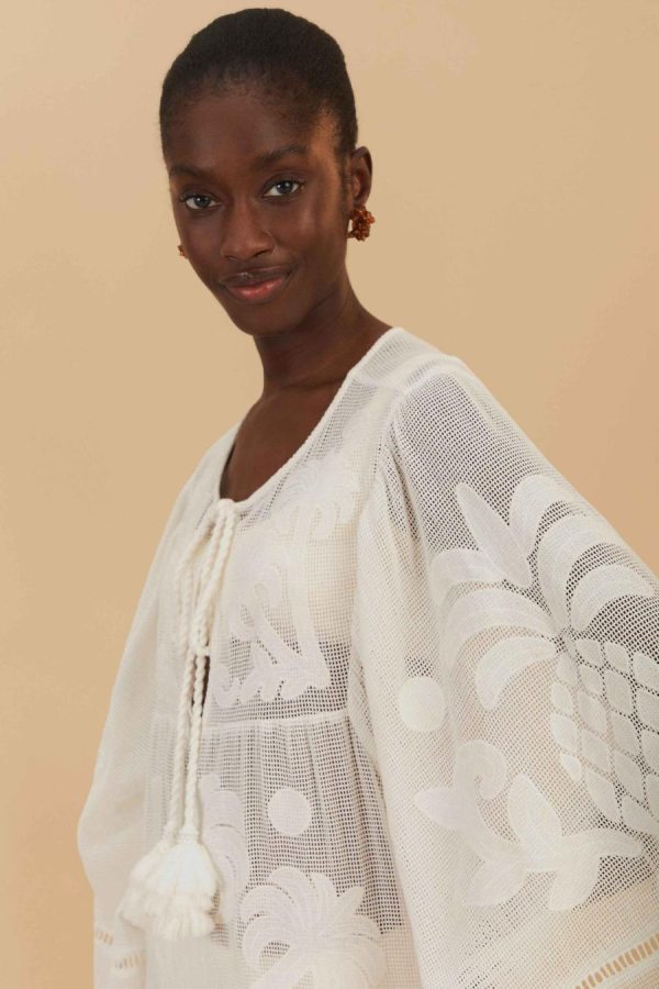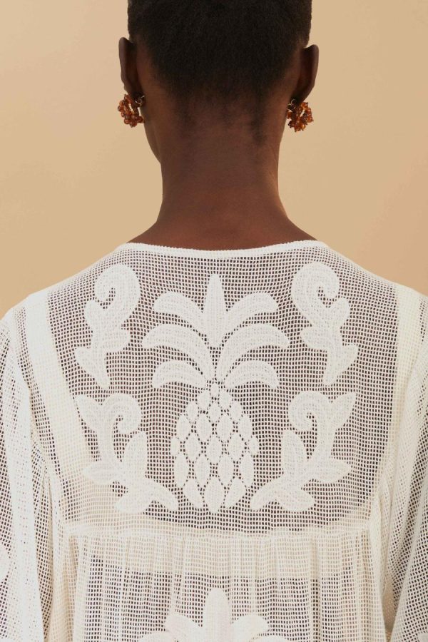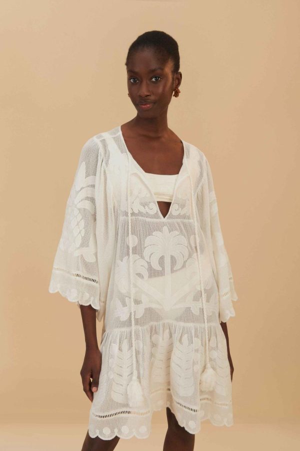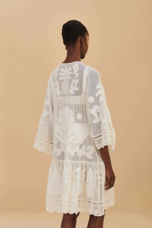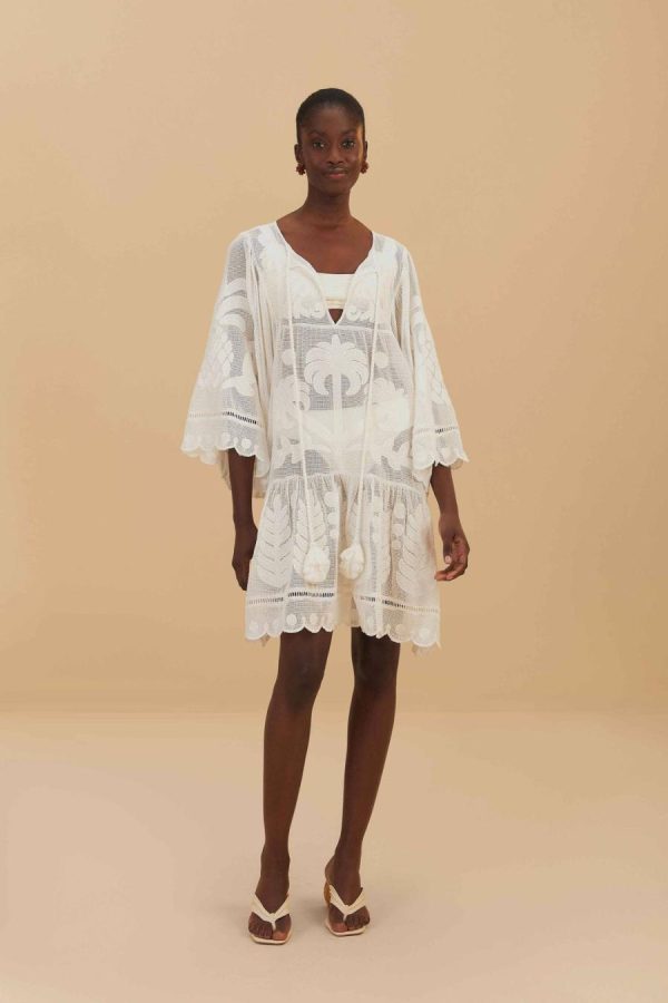 Embrace the essence of tropical elegance with the White Palm Tree Cutwork Mini Dress. This charming piece showcases intricate cutwork embroidery of exotic palm motifs, creating a striking contrast against the ethereal white fabric. The round neckline and floaty silhouette are complemented by whimsical sleeves and hemline, subtly cinched at the waist for a flattering shape. A celebration of craftsmanship and style, this dress radiates a serene, sun-kissed vibe ideal for savoring warm moments.