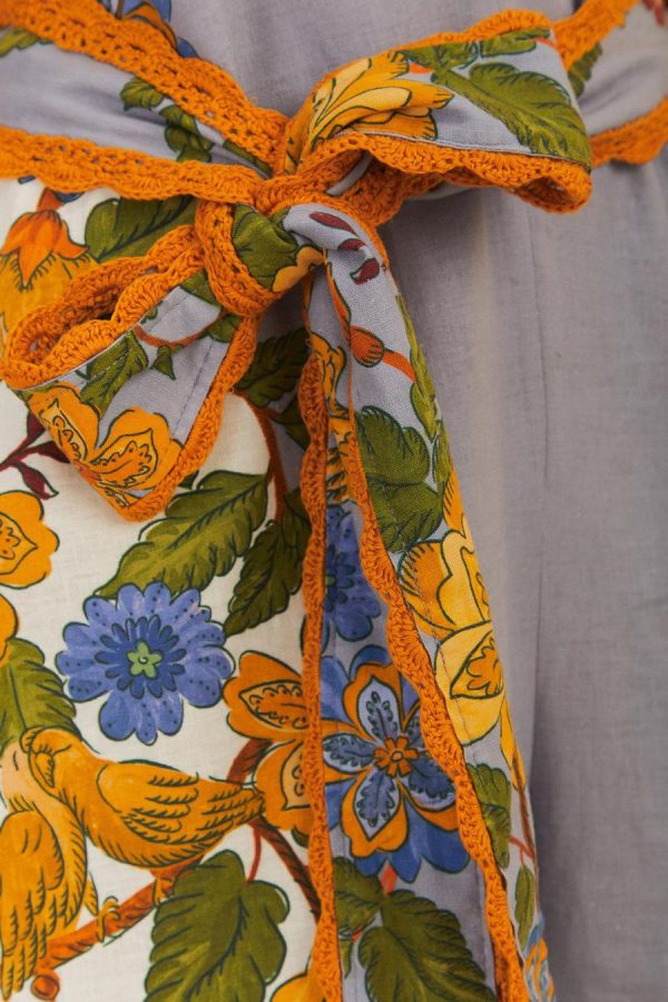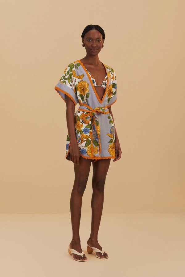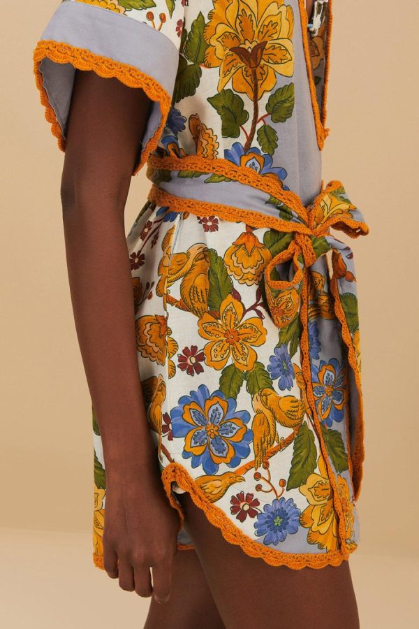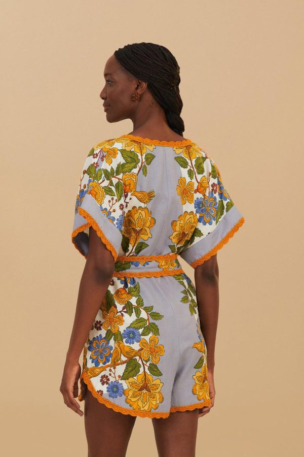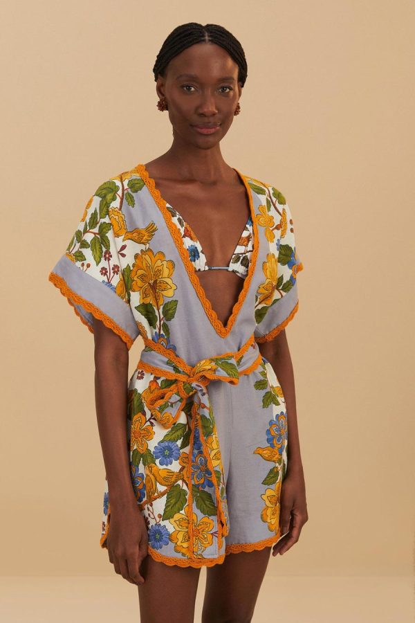Embrace a burst of joy with the Blue Garden Scarf Romper, featuring a vibrant mix of blue and yellow floral prints that commands attention. Comfort meets chic with the flattering V neckline and breezy silhouette, cinched at the waist with a playful crochet belt. The contrast trim adds a touch of elegance, making this piece a delightful choice for any sun-soaked adventure.
